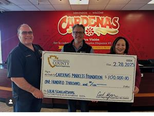 San Bernardino County Board Supervisor Curt Hagman presents a $100,000 check to Cardenas Markets Foundation Board President Adam Salgado and Board Secretary Marisa Kutansky, supporting local scholarships for students in District 4.
